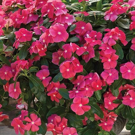 Катарантус ампельный Кора Каскад (Catharanthus roseus (Vinca) Cora Cascad). Первая и единственная серия ампельного катарантуса, обладающая резистентностью к фитофрозу. Растения прекрасно переносят жаркую погоду и прямые солнечные лучи.
