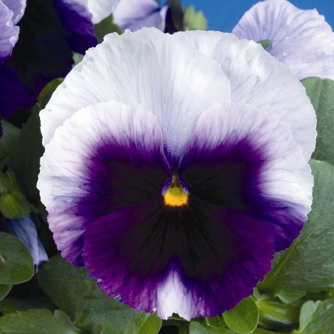 Анютины глазки Лорд Биконсфилд. Растение с быстрым ростом, красиво и обильно облиственное, с крупными цветками, сидящими на короткой и твердой цветоножке. Высота растения 15см. Цветки 5-6 см в диаметре. Верхние лепестки бело-голубые, нижние темно-фиолетовые, по краям лепестков сиреневая кайма. Цветет с июня до морозов. Используют для клумб и бордюров, в цветники - группами.