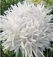 Астра коготковая Белая. Растение пирамидальной формы, высотой 70-75 см. Цветоносы прочные, длиной 50 см. Соцветия округло-плоские, махровые, диаметром 7-10 см. Язычковые цветки сложены по длине в трубки, слегка загнуты внутрь, белой окраски, закрывают диск жёлтых трубчатых цветков. Цветет август-сентябрь. Используют очень широко: для посадки в сборные цветники группами, на рабатки — рядами, для бордюров.