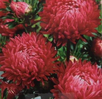 Астра пионовидная Красная башня. Растение высотой 60-65 см. Соцветия темно-карминно-красные, махровые, диаметром 8-10 см, до 10 штук на растении. Используют очень широко: для посадки в сборные цветники группами, на рабатки - рядами и на срезку.