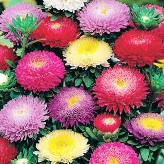 Астра помпонная Смесь окрасок. Великолепные букеты шикарных оттенков. Растение высотой 60-65 см. Соцветия махровые, диаметром 8-10 см, 8-12 штук на растении. Цветет август-сентябрь. Используют очень широко: для посадки в сборные цветники группами, на рабатки – рядами и на срезку.