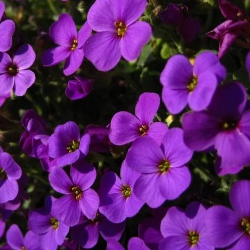 Аубреция Фиолетовая. Стелющиеся побеги образуют плотные ковры. Миниатюрные сине-фиолетовые цветки собраны в кисти. Цветёт на второй год с мая по июнь. После цветения желательно произвести обрезку цветоносов, чтобы ограничить рост и вызвать вторичное цветение осенью. Используется для каменистых горок, бордюров и переднего плана рабаток.