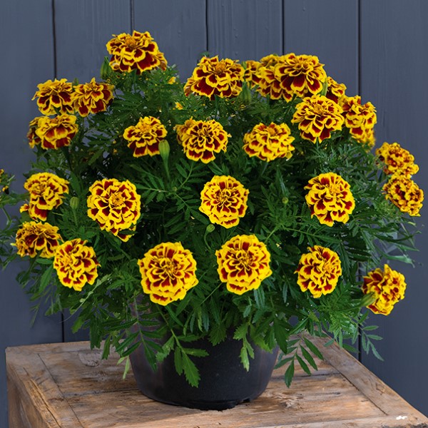 Бархатцы отклоненные Манго Танго (Tagetes patula Mango Tango) - компактный сорт бархатцев с крупными полумахровыми анемоновидными соцветиями.