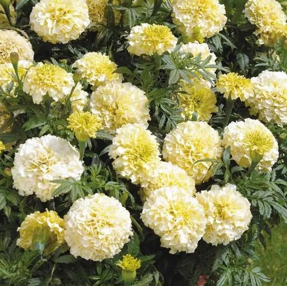 Бархатцы прямостоячие Альбатрос. Шарообразные соцветия-корзинки, диаметром до 10 см, необычной кремово-белой окраски. Растение высотой около 35-40 см. Цветение обильное продолжительное - с июля до заморозков. Чтобы продлить цветение, необходимо удалять увядшие цветки. Используют для клумб, рабаток.