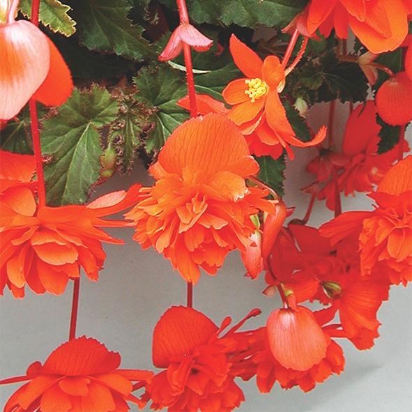 Бегония ампельная Шансон (Begonia tuberhybrida Chanson). Непревзойденная по декоративности ампельная клубневая бегония с махровыми и полумахровыми камелиевидными цветками.