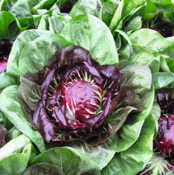 Цикорий Россини F1 листовой Радичио Россо. Среднепоздний -90-100 дней. Уборка урожая: поздняя осень -начало зимы. Красивый блестящий красный цвет, идеально подходит для смешанных салатных упаковок. Гибрид включен в Госреестр для выращивания в ЛПХ. Рекомендуется для использования в свежем виде и кулинарии. Среднеспелый гибрид. Кочанный. Розетка листьев полуприподнятая до горизонтальной, высотой 35 см, диаметром 30 см. Лист среднего размера, округлый, зеленый с антоциановой окраской, слабопузырчатый, центральная жилка листа белая. Кочан обратнояйцевидный, плотный, наружные листья красные. Масса кочана - до 200 г. Урожайность - 3,5 кг./кв.м.