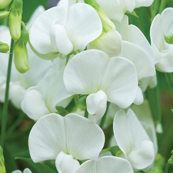 Чина широколистная Белый жемчуг. Цветки крупные, белые, собраны по 3-10 штук в рыхлые, кистевидные соцветия. Цветёт обильно на второй год с июня по сентябрь. Используют для вертикального озеленения, в групповой посадке на газонах при наличии опоры, на срезку для маленьких букетиков.