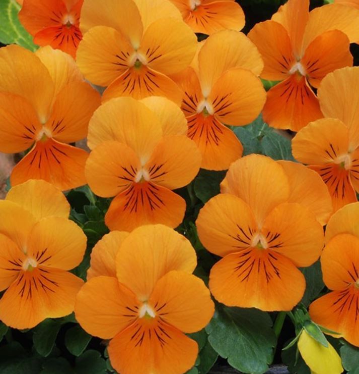 Фиалка рогатая Совершенство оранжевая. Стебли образуют плотные подушки. Крупные, округлые, оранжевые цветки. Одновременно на кустике насчитывается до 60 цветков. Цветёт с мая по сентябрь. Используют для бордюров, альпинариев, миксбордеров, идеально подходит для создания цветочного коврика.