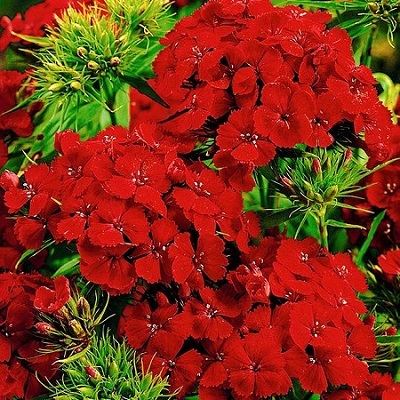 Гвоздика Турецкая Алая красавица. Кустик высотой 50 см. Листья линейно-ланцетные, зеленые. К концу 1-го года выращивания образуется розетка прикорневых листьев. На следующий год растения цветут с конца июня в течение месяца. Используют для сборных цветников, рабаток и для срезки.