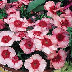 Гвоздика Супер Партфайт. Однолетник. Генетически карликовый гибрид китайской гвоздики. Высота кустика -15 см. Отличительной особенностью серии является очень крупный цветок с двойной окраской. Все растения выровнены по размеру и цветению. Зацветает через 15-18 недель после посева, цветет обильно и непрерывно все лето до самых заморозков. Прекрасный выбор для садовых контейнеров, вазонов, может выращиваться как горшечная культура.