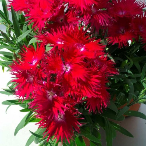 Гвоздика Супра (Dianthus interspecific Supra). Компактная межвидовая гибридная гвоздика с хорошим боковым ветвлением и крупными ажурными игольчатыми цветками до 4 см в диаметре.
