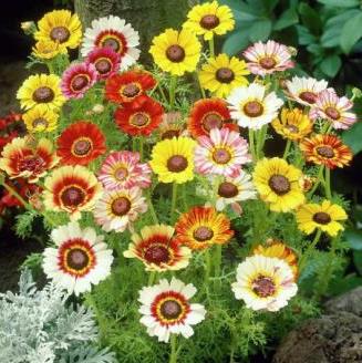 Хризантема килеватая Смесь окрасок. Густоветвистое, прямостоячее растение высотой до 60 см образует куст диаметром 50-60 см. Соцветия имеют четкие разноцветные круги вокруг темной середины. Характеризуется быстрым ростом и ранним, продолжительным цветением (с июня по октябрь). Используют для посадки на клумбах, в смешанных группах, рабатках и на срезку.