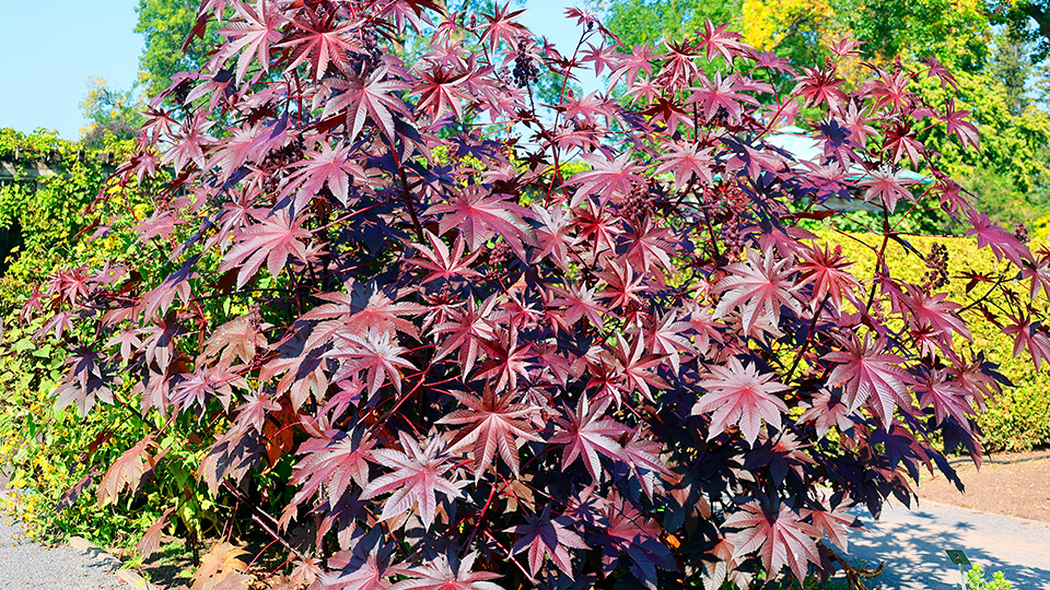 Клещевина брнзоволистная Сангвинеус (Ricinus communis Sanguineus). Крупное травянистое растение высотой до 1,5 м. Стебель прямой, ветвистый. Листья крупные, красно-пурпурного цвета. Используется для декорирования стенок, посадки группами и одиночно на газоне.