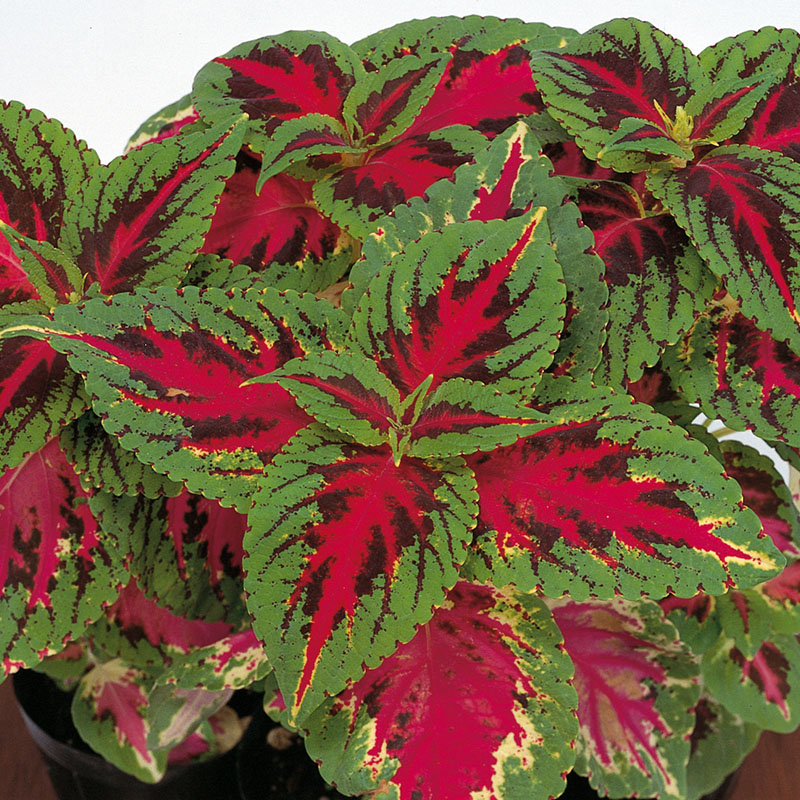 Колеус Суперфайн Рейнбоус F1 (Plectranthus scuttelarioides Superfine Rainbow F1) -  полукарликовая серия колеуса, вырастает до 35 см в высоту.
