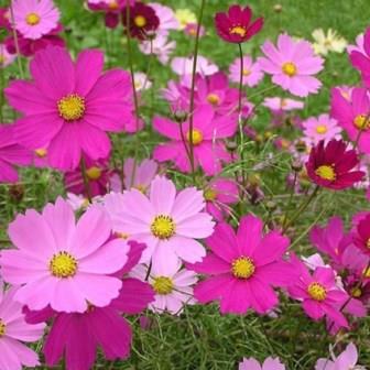 Космея Сенсация. Декоративное растение с ажурными сильнорассеченными листьями, высотой до 90 см. Цветки собраны в соцветия-корзинки, диаметром 7-10 см и расположены одиночно на концах стеблей. Язычковые цветки розовые, карминные. Трубчатые в центре соцветия-желтые. Применяют для посадки на заднем плане цветников, декорирования оград и для срезки.