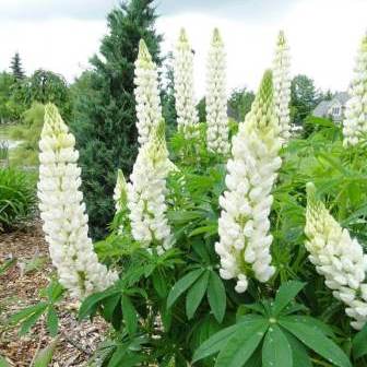 Люпин Белый аист. Растение высотой до 100 см. Листья красивые, пальчато-сложные, на длинных черешках. Кремово- белые цветки собраны в кистевидные соцветия 35-40 см длиной. Цветет в июне. Используют для бордюров, рабаток, миксбордеров.