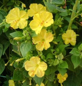 Мирабилис Желтый леденец. Ароматные цветки жёлтой окраски диаметром 5-6 см, раскрываются после 15 часов, а закрываются утром. Многолетнее растение, используется как однолетнее. Кустики 50-80 см высотой. Стебли прямостоячие, ветвистые. Цветёт обильно с июня до заморозков. Используют для оформления цветников, рабаток.