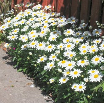 Нивяник Белый танец. Высота растения до 80 см. Крупные, в диаметре 6 см, цветки с белыми широкими лепестками и жёлтой серединой. Отличается ранним цветением. Используются для групповых посадок в цветники, рядами на рабатки, а также для срезки в букеты.