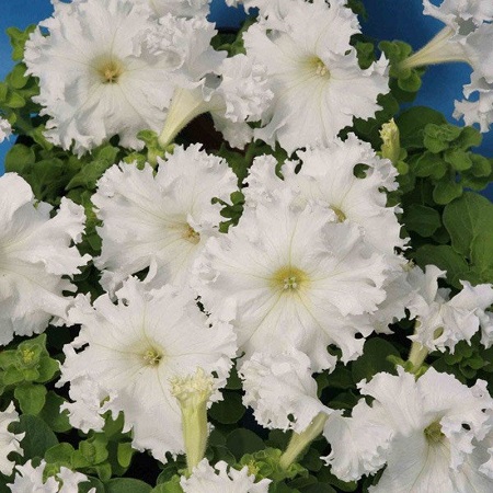 Петуния грандифлора фимбриата Крайкови завой - крупные цветки белой окраски с волнистыми и бахромчатыми краями диаметром 8 см, растения высотой 35 см, сорт особенно пригоден для посадок в горшки и ящики.Оригинальная серия с волнистым бахромчатым краем. Формирует множество крупных привлекательных цветков на одном растении. Прекрасный выбор для посадок в горшки, контейнеры, вазоны. Подходит для высадки в открытый грунт.Группа традиционных сортов с бахромчатыми краями цветков.