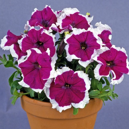Петуния мультифлора Кэнди. Растения компактные, хорошо разветвленные, все расцветки имеют белую кайму. Серия устойчива к неблагоприятным погодным условиям и болезням. Быстро восстанавливается после дождя / обильного полива, прекрасно переносит жару, не теряя своей высокой декоративности. Отличный выбор для открытого грунта или контейнеров.