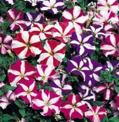 Петуния Старс микс. Красивые крупные цветы, разнообразной окраски, украшают кустик высотой 25-35 см. Обильно цветет с июля по сентябрь. Используют в клумбах для ярких групп, бордюрах, рабатках, в подвесных корзинах.