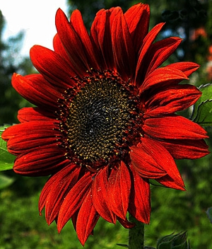 Подсолнечник однолетний Малиновая королева. Высота растения 180-200 см. Крупные бархатные темно- малиновые корзинки с тёмным донцем. Цветет с июня по сентябрь. Используют для посадки большими группами, создания декоративных стенок и живой изгороди, на срезку.
