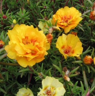 Портулак крупноцветковый Солнечная страна золотой. Многолетнее растение, используемое как однолетнее. Образует кустик высотой 10 см. Золотисто-желтые, похожие на розочки, экстра махровые цветы, диаметром 3-4 см. Цветет с июня до заморозков.