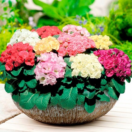 Примула Примлет (Primula acaulis Primlet) - махровая компактная примула, отличается пышными соцветиями из розовидных цветков диаметром 4-5 см, напоминающими миниатюрные букетики роз.