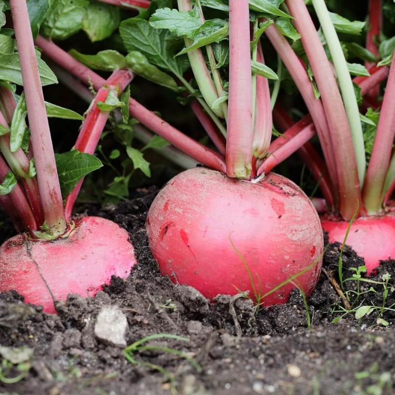• Корнеплод округлой формы со сбегом вниз, короткий, среднего диаметра, окраска кожуры карминная, основание округлое.