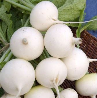 • Корнеплод округлый, белый.