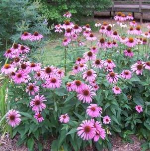 Рудбекия пурпурная Розовая. Растение высотой 60-100 см с прямыми шероховатыми буровато-зелеными стеблями. Прикорневые листья собраны в розетку, стеблевые – ланцетные, шероховатые. Крупные соцветия-корзинки с поникшими темно-розовыми лепестками. Цветет август-сентябрь. Используют для отдельных групп на газоне, в сочетании с низкорослыми многолетниками, около деревьев и срезки.