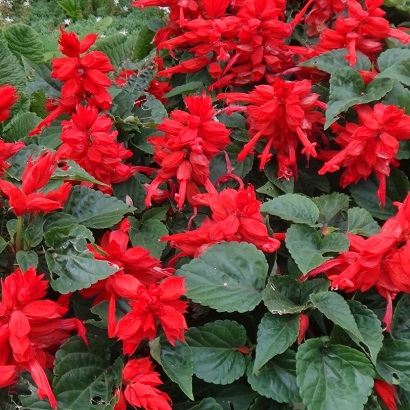Сальвия сверкающая Карабинер. Куст компактный, с темно-зеленой листвой, высотой 25 см. Соцветия крупные, ярко-красные. Сорт поздний. Цветет обильно с конца июля до заморозков. Используют для рабаток, бордюров, клумб.