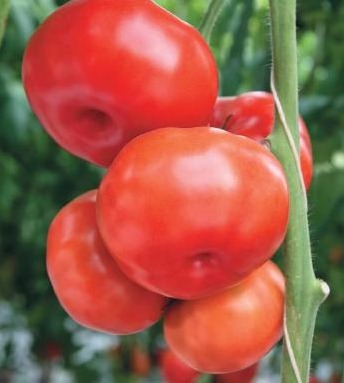 Томат Югра F1. Новый индетерминантный гибрид томата для продлённого оборота.Растение полугенеративного типа развития.Соцветие простое,прочное,с 7-8 плодами.Плоды плоскоокруглой формы,прочные,насыщенного красного цвета,с глянцевой поверхностью, высокая однородность плодов по массе и форме. Среднеплодный томат, массой 200-250 гр. Вегетативный срок 105-110 дней.