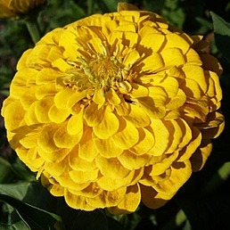 Цинния георгиноцветковая Птичка канарейка. Георгиноцветковая группа. Растение мощное, ветвистое от основания, высотой 80-90 см. Плотные георгиноцветковые полушаровидные соцветия, диаметром 8-10 см, желтые с лимонным оттенком. Цветет с  июля по сентябрь. Используют для оформления цветников, рабаток и срезки.
