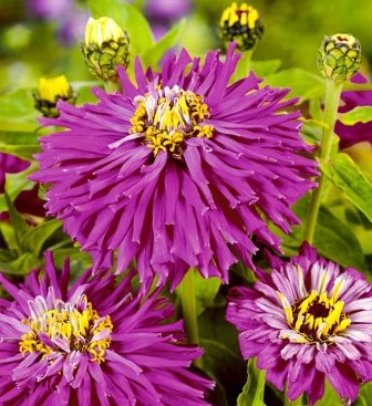 Цинния кактусовидная Лиловый император. Растение мощное, ветвистое от основания, высотой 70-75 см. Полушаровидные махровые соцветия, диаметром 8-10 см, лавандовой окраски. Язычковые цветки узкие, свёрнутые по длине в трубочки, причудливо изогнуты. Цветет с июля по сентябрь. Широко используют для цветников и на срезку.