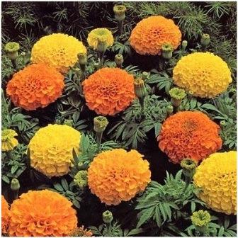 Бархатцы прямостоячие Махровые смесь окрасок. Цветки собраны в крупные, махровые и шарообразные соцветия-корзинки, жёлтой и оранжевой окраски. Высота растения 80-90 см, диаметр цветка 9-10 см. Чтобы продлить цветение, необходимо удалять увядшие цветки. Используют для клумб, рабаток, высоких групп, балконов и срезки.