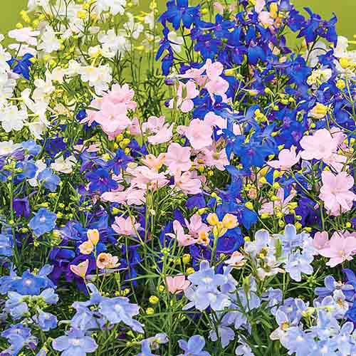 Дельфиниум крупноцветковый Баттерфляй микс. Высота растения около 40 см, стебли прямые, опушенные. Листья на длинных черешках, пальчато-рассеченные, сверху зеленые, снизу беловатые. Цветы белые, голубые, синие, розовые собраны в редкую кисть на конце стебля. Цветет июль-август. Используют для создания смешанных групп, рабаток, в миксбордерах и на срезку.