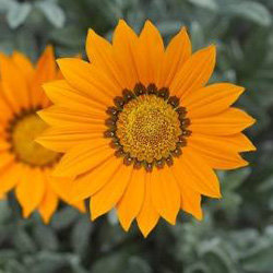 Газания Фрости Кисс. Растения с необычной серебристой окраской листьев, раннецветущие, выровненные по габитусу. Крупные соцветия обильно покрывают кустики высотой всего 20-25 см. Это ярко цветущее растение, широко использующееся на клумбах, рабатках, для бордюров, альпийских горок, миксбордеров, балконов, контейнеров и букетов.Высота – 20-25 см. Листья собраны в прикорневую розетку, диаметр растения – около 20-25 см. Цветки до 8 см в диаметре открыты только в солнечную погоду. Цветет с конца июня по сентябрь.