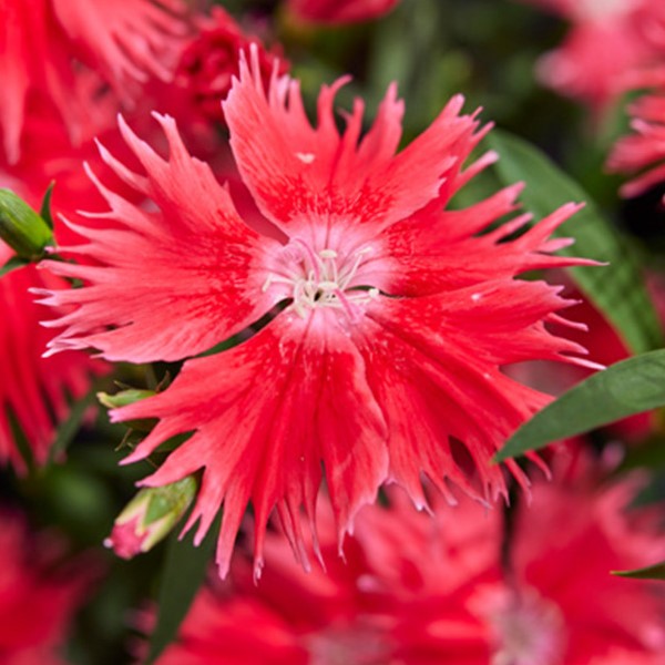 Гвоздика Супра (Dianthus interspecific Supra). Компактная межвидовая гибридная гвоздика с хорошим боковым ветвлением и крупными ажурными игольчатыми цветками до 4 см в диаметре.