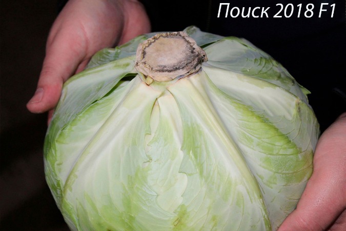 Капуста белокочанная Поиск 2018 F1. Среднепоздний гибрид (120-130 дней). Масса кочана 3,0-5,0 кг. Кочан  плоско-округлой формы, плотный, с отличной внутренней структурой, покрытый двумя кроющими листьями. Длина внутренней и наружной кочерыг средняя.  Вкус отличный и хороший. Идеальная морфологическая однородность растений. Устойчив к фузариозному увяданию.