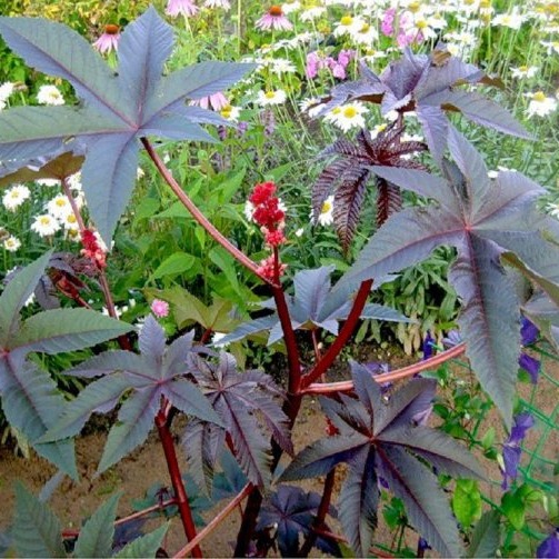 Клещевина Гибсона. Крупное травянистое растение высотой до 1,5 м. Стебель прямой, ветвистый. Листья крупные, темно-красного цвета. Используется для декорирования стенок, посадки группами и одиночно на газоне.