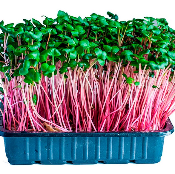 Редис Белокройка. Микрозелень редиса – растения с семядольными листочками темно-зеленого цвета и ярко-розовыми стебельками. Ростки сочные, нежные. Аромат молодого весеннего редиса. Большое содержание биологически активных веществ. Как полезное дополнение к различным блюдам. Используется для декорирования блюд.