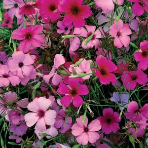 Вискария Нимфа. Смесь цветет в июле–сентябре. Кусты прямостоячие, многостебельные, до 50 см высотой. Стебли сильно ветвятся. Простые пятилепестковые цветочки  Ø 2-3 см собраны в рыхлые метельчатые соцветия. Огромная масса цветов буквально образует разноцветные облака над посадками. За красоту цветения растение получило название «небесная роза». Вискария красиво смотрится массивами. Используется для объемного наполнения цветников вместе с другими летниками.